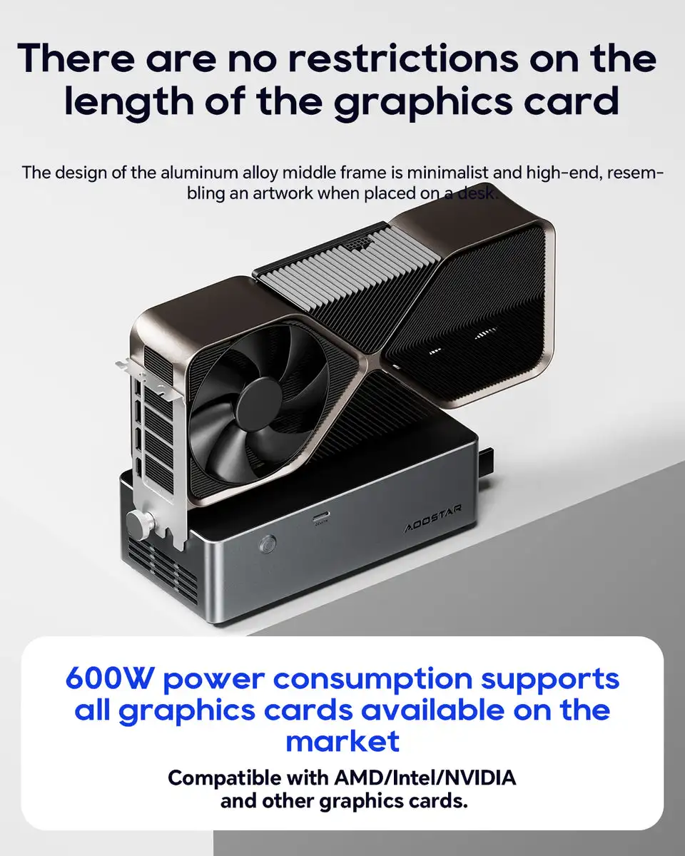 A:Supports GPUs up to 250W TDP, including RTX 4070, RX 7700XT and below. Open-frame design accommodates any card length.