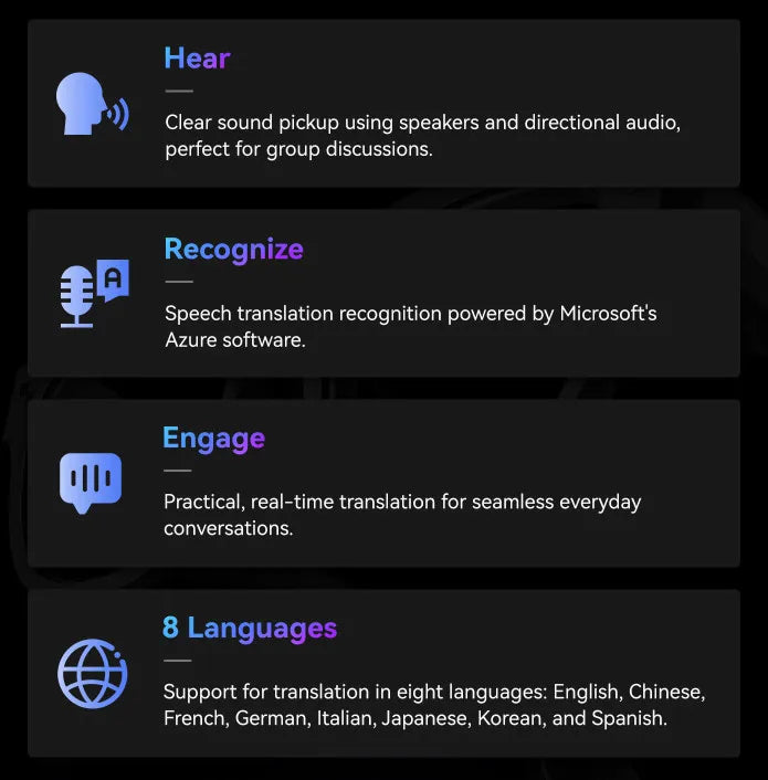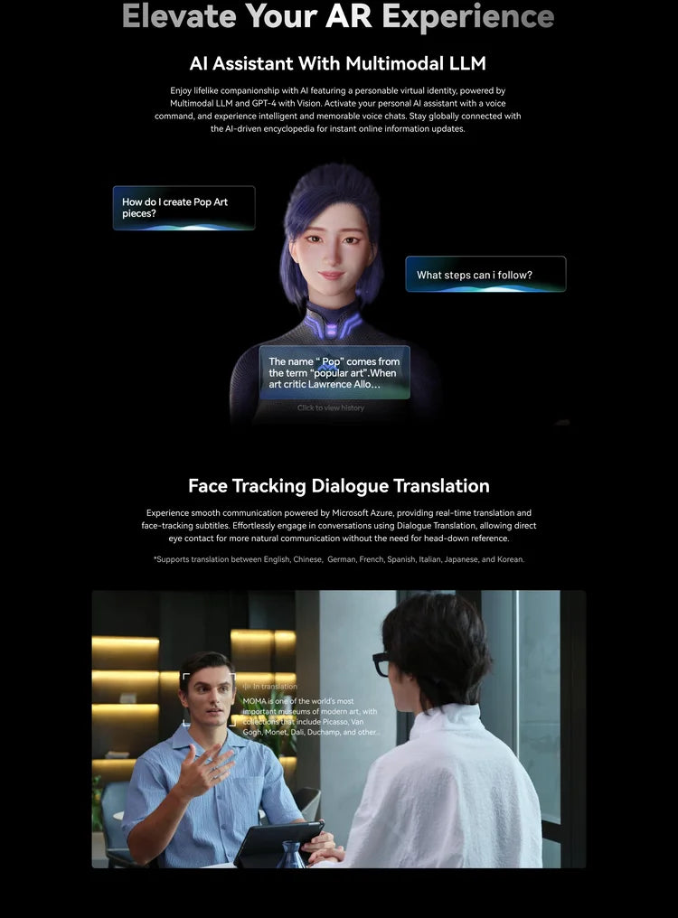 8-language dialogue translation based on face tracking: automatic speech recognition and real-time subtitles, supporting translation among English, Chinese, Korean, German, French, Spanish, Japanese and Italian.