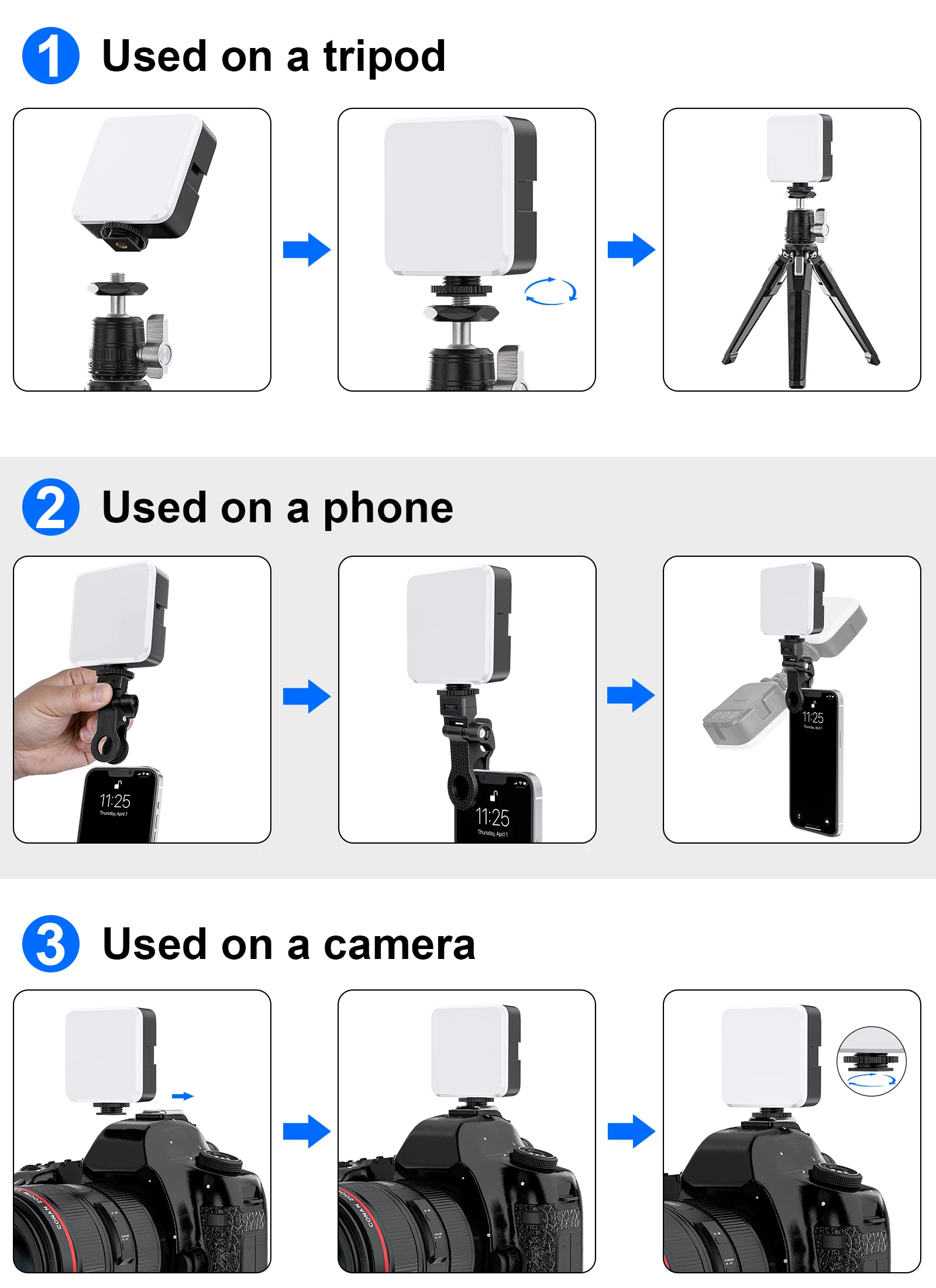 The design of the cold shoe and the clip allows for easy installation on camera, tripod, mobile phone and computer.