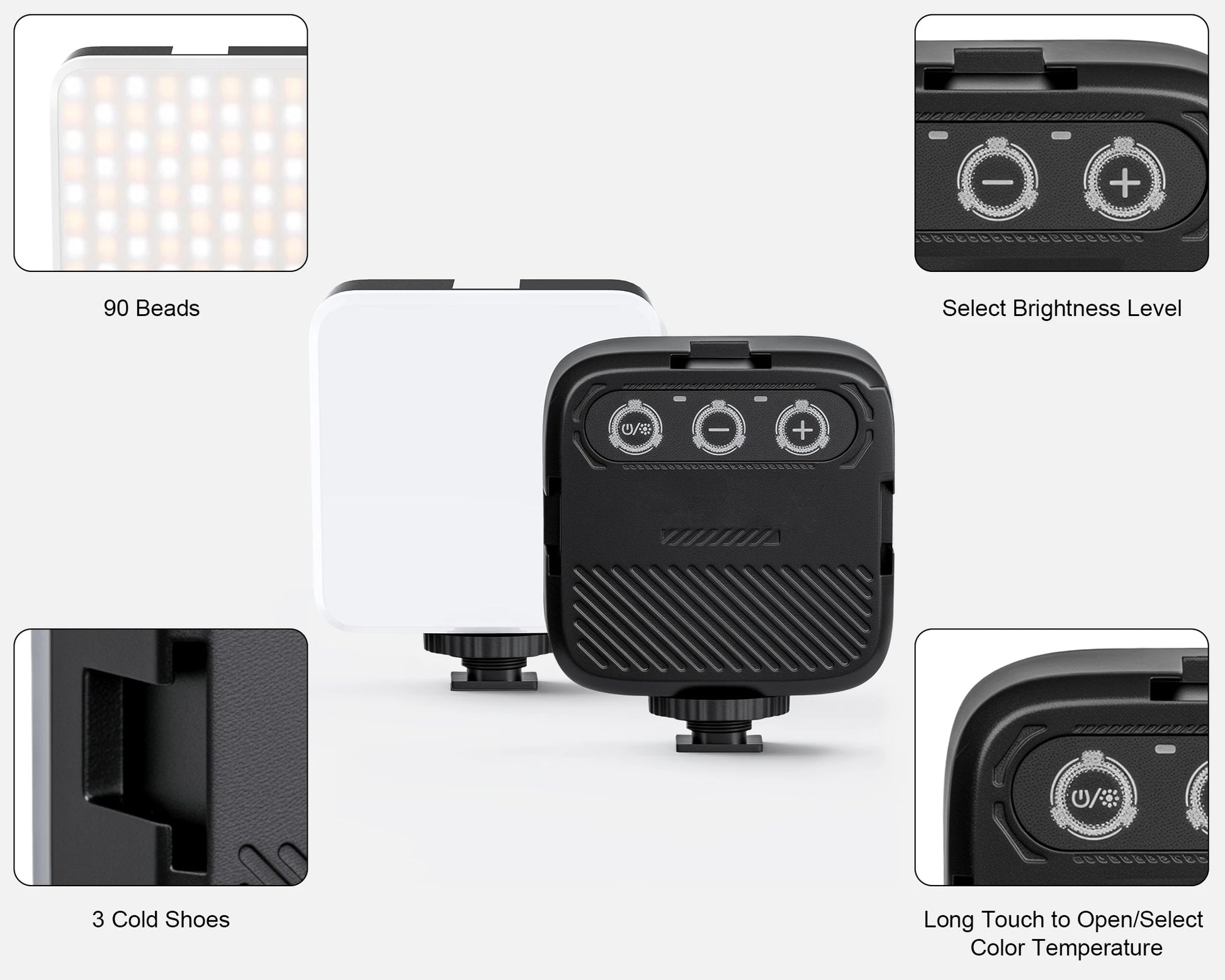 This phone light has ten brightness levels within each mode. With 90 lamp beads, you can easily adjust the brightness using "+" and "-" key to suit different environments, making it ideal for photography and video calls.