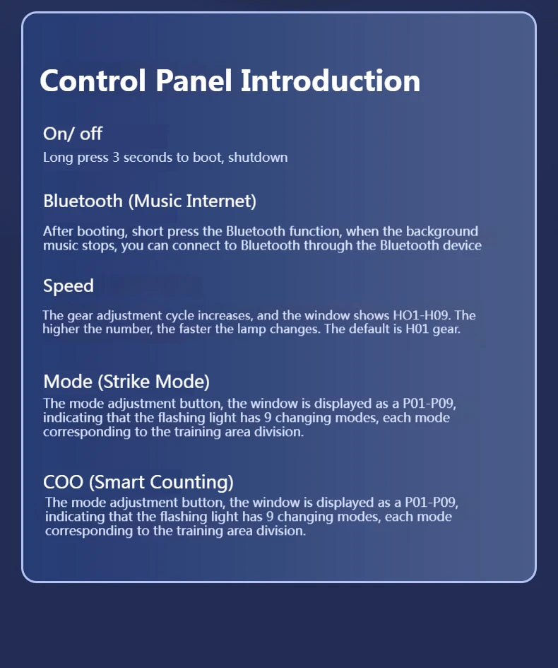 【COO (Smart Counting)】The mode adjustment button, the window is displayed as a P01-P09, indicating that the flashing light has 9 changing modes, each mode corresponding to the training area division.