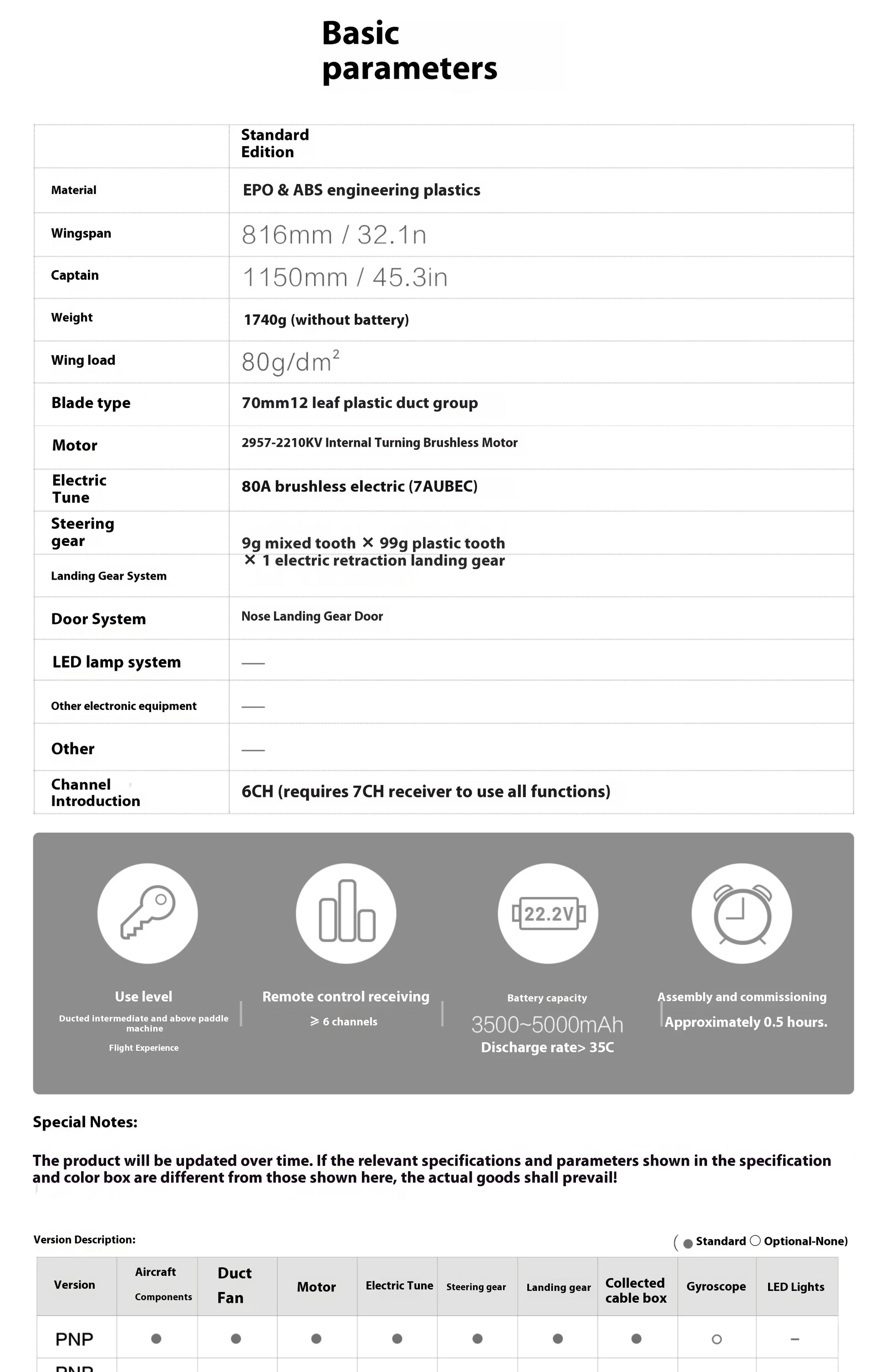 Single engine fighter jet: PNP version, PNP (Wings Defender version/version with gyroscope), KIT+S (aerodynamic version)