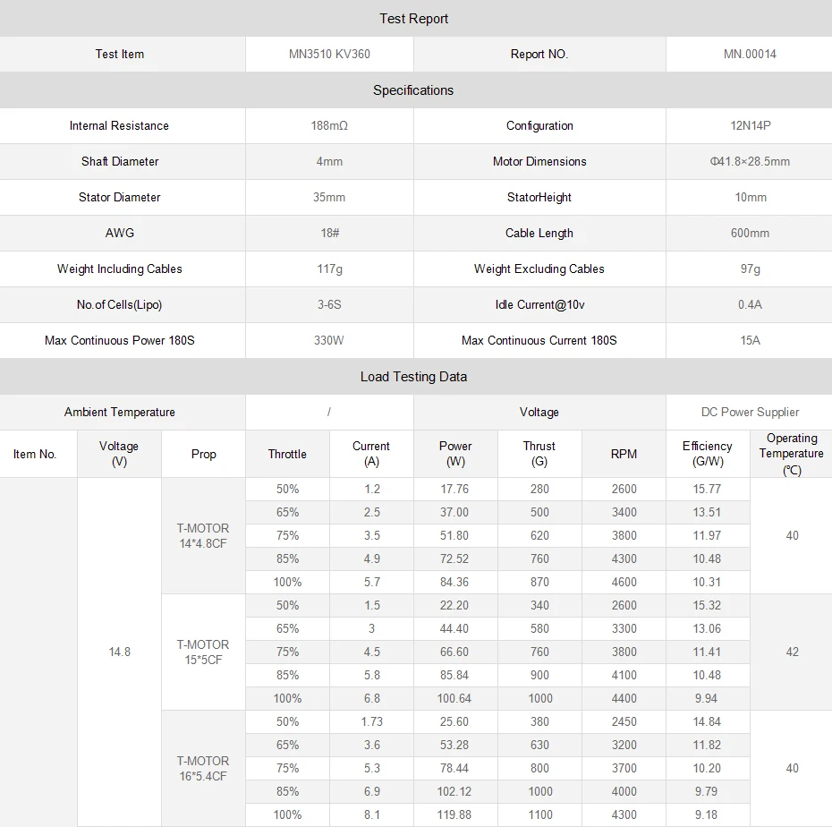 T-Motor MN3110 KV470/KV700/KV780 Navigator Series Brushless Motor is a high-quality, durable motor designed for reliable performance in aerial photography and various multi-rotor, VTOL, and fixed-wing applications. Key features include smooth operation, high-quality EZO bearings for extended lifespan (MTBF ~1000 hours), and a maximum thrust of 1.2kg. Optimized for efficiency and long flight times, it's recommended for use with a T-MOTOR P15*5'' propeller. The ''Navigator'' series emphasizes reliability and robust construction for dependable aerial platforms.